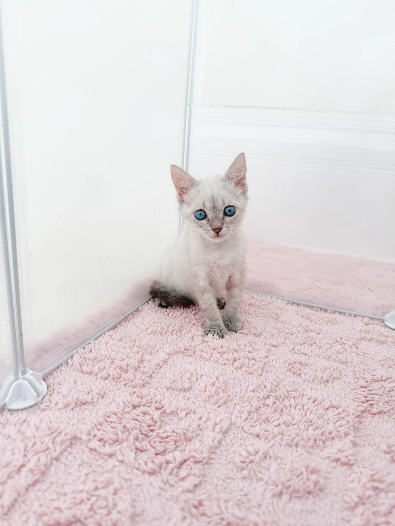 Clover is just a darling darling girl. She is essentially blind and will have a double enucleation once she’s big enough to undergo surgery. Clover also has pectus excavatum for which she is not eligible for corrective surgery. Clover must be adopted with another kitten or into a home with another young, playful friendly cat.