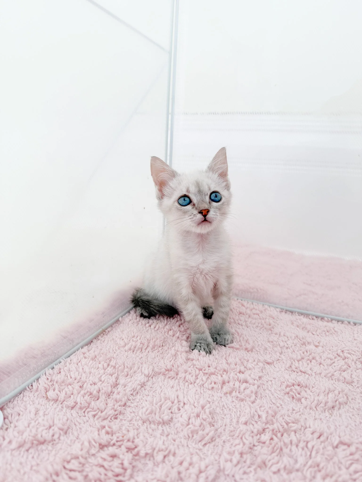 Sunny is a one-of-a-kind little ball of sunshine who truly lives up to his name. He and his sister Clover were rescued during the big freeze and were recommended for euthanasia by every place their finders brought them to because of their congenital eye deformities known as eyelid agenesis. Sunny also came with a grade 1 heart murmur, so we had him fully checked out and his heart is structurally normal! The murmur only shows up when he’s stressed, and he has an unusual little ventricle feature is totally benign. The only thing he may need in the near future is a cryotherapy procedure for his eyelashes that irritate his eyes which will be covered by the rescue. Sunny is very talkative and hates being alone. He does need his eyes wiped gently in the mornings and evenings. Sunny must be adopted with another kitten friend or into a home that already has a young, playful friendly cat.
