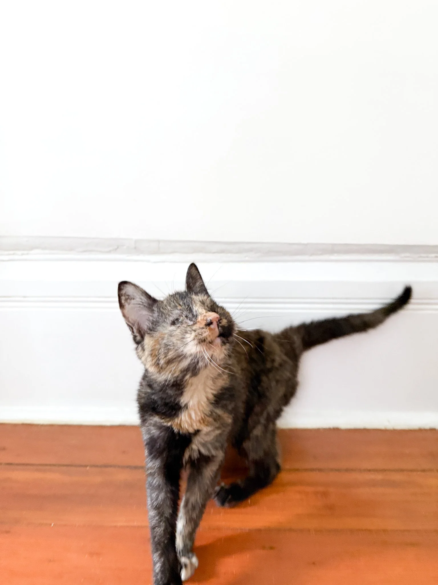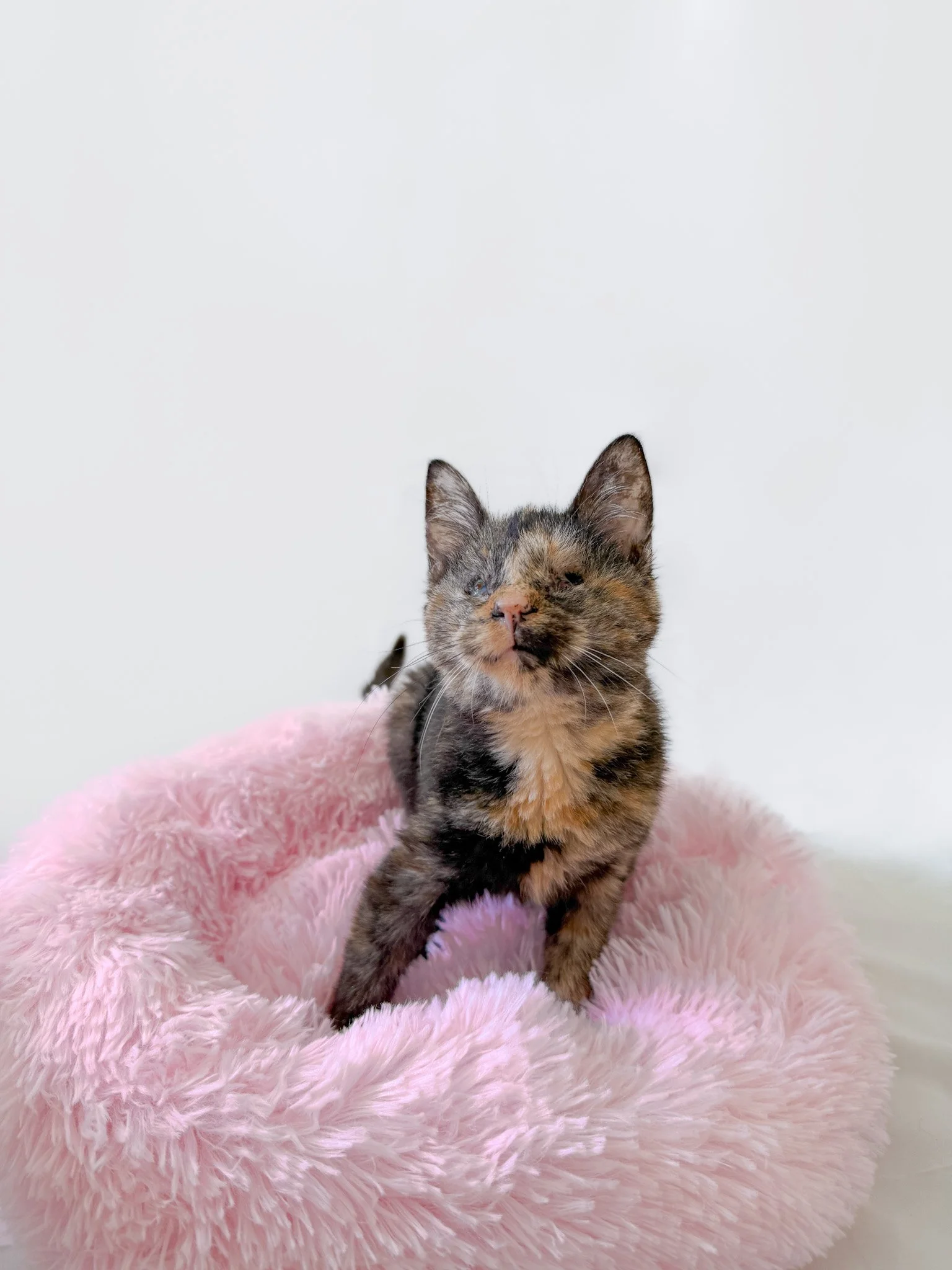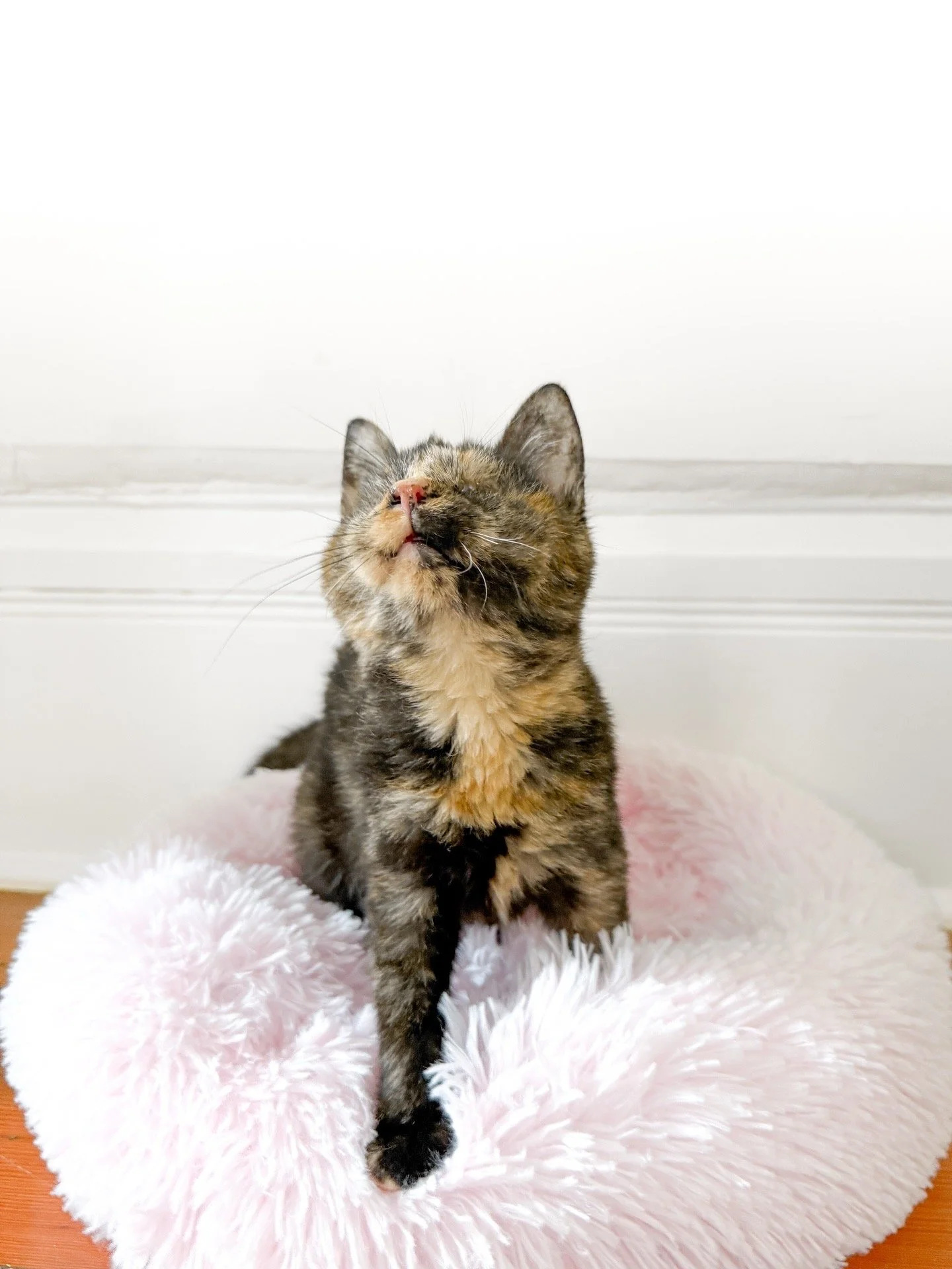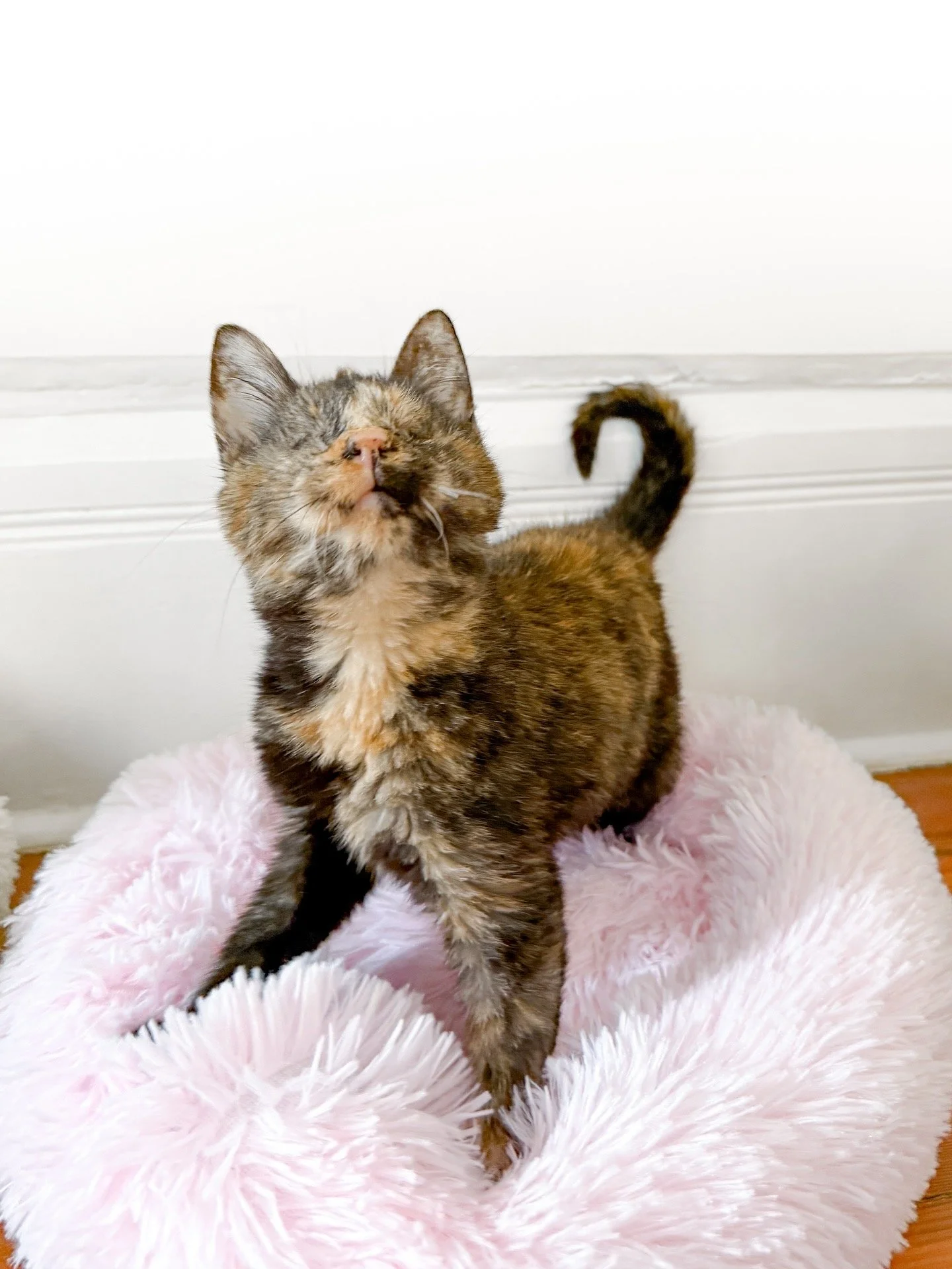 Clover is our darling petite tortie girl who has never even heard the slander of tortitude. She is as velcro as they come and needs a home with someone who is home more often than not. Clover is blind and in the process of having both of her unfunctional eyes removed. She also has pectus excavatum which she was ineligible for surgery for but it doesn’t cause her any issues other than being small. Clover will do well in a home with other kitties and calm pups.