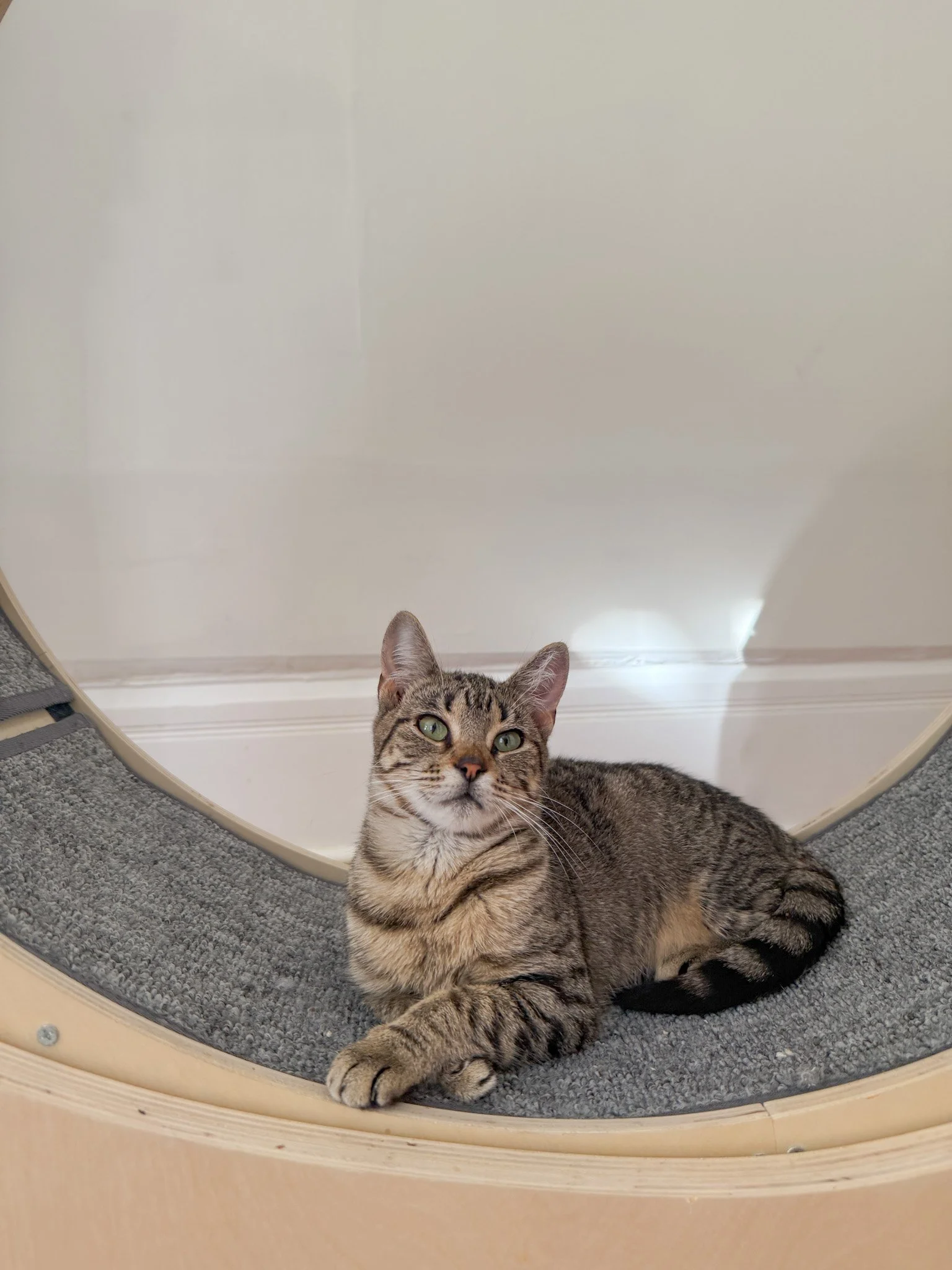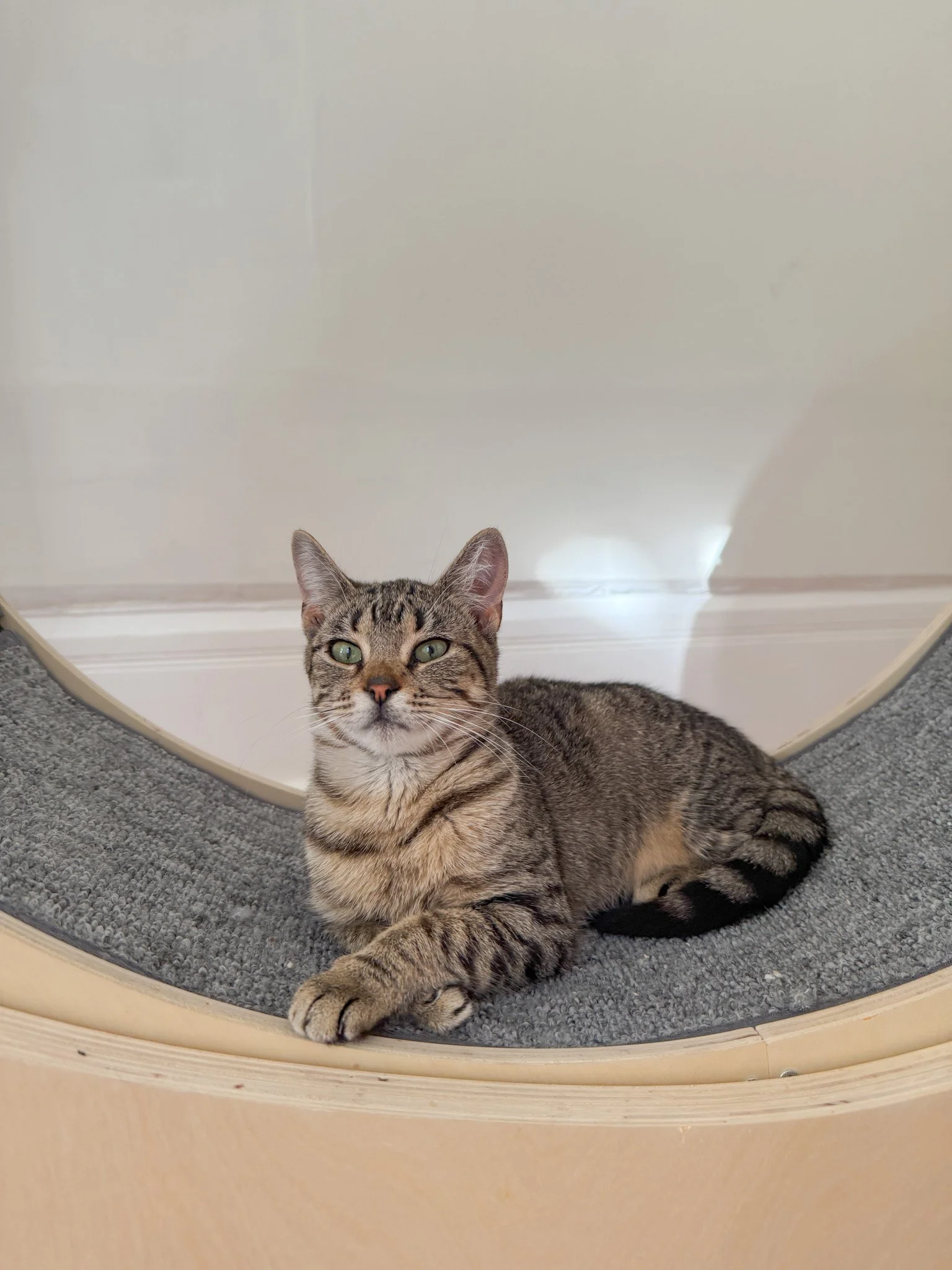 Bex is our petite stompy perfect sweet and sassy girl. Her mild cerebellum hypoplasia makes her walk different than most kitties and she has a sort of high step/stomp to her adorable walk. She can do most everything but has trouble with stairs so she should be kept away from them without supervision. Bex would do really well adjusting to a younger kitten she could play with because she loves playing with her foster siblings. Bex likes to be the favorite of her human and is very people oriented.