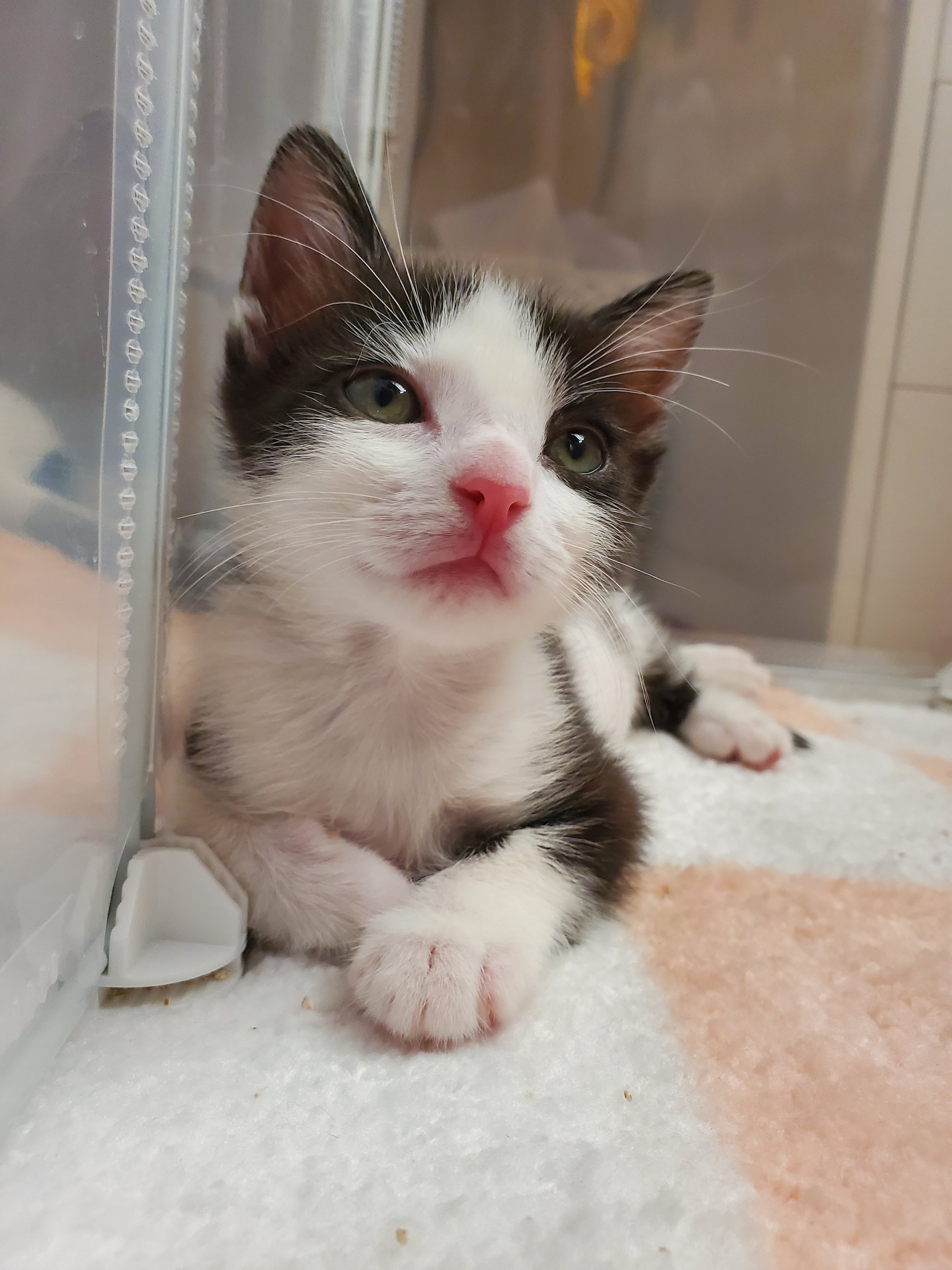 Oh Alfred, you couldn’t be more of a doll. Alfred always looks like that wide eyed and curious and it is a constant source of levity. Alfred is very nosy and super people oriented. He’s also very playful and delights in getting up to shenanigans with his foster siblings. Alfred must be adopted with another kitten or into a home that already has at least one young, playful cat.