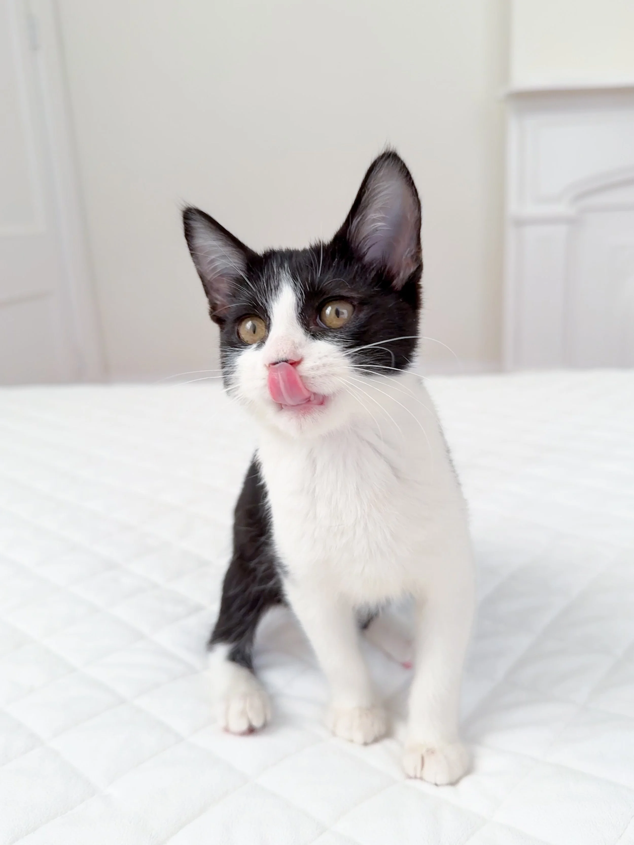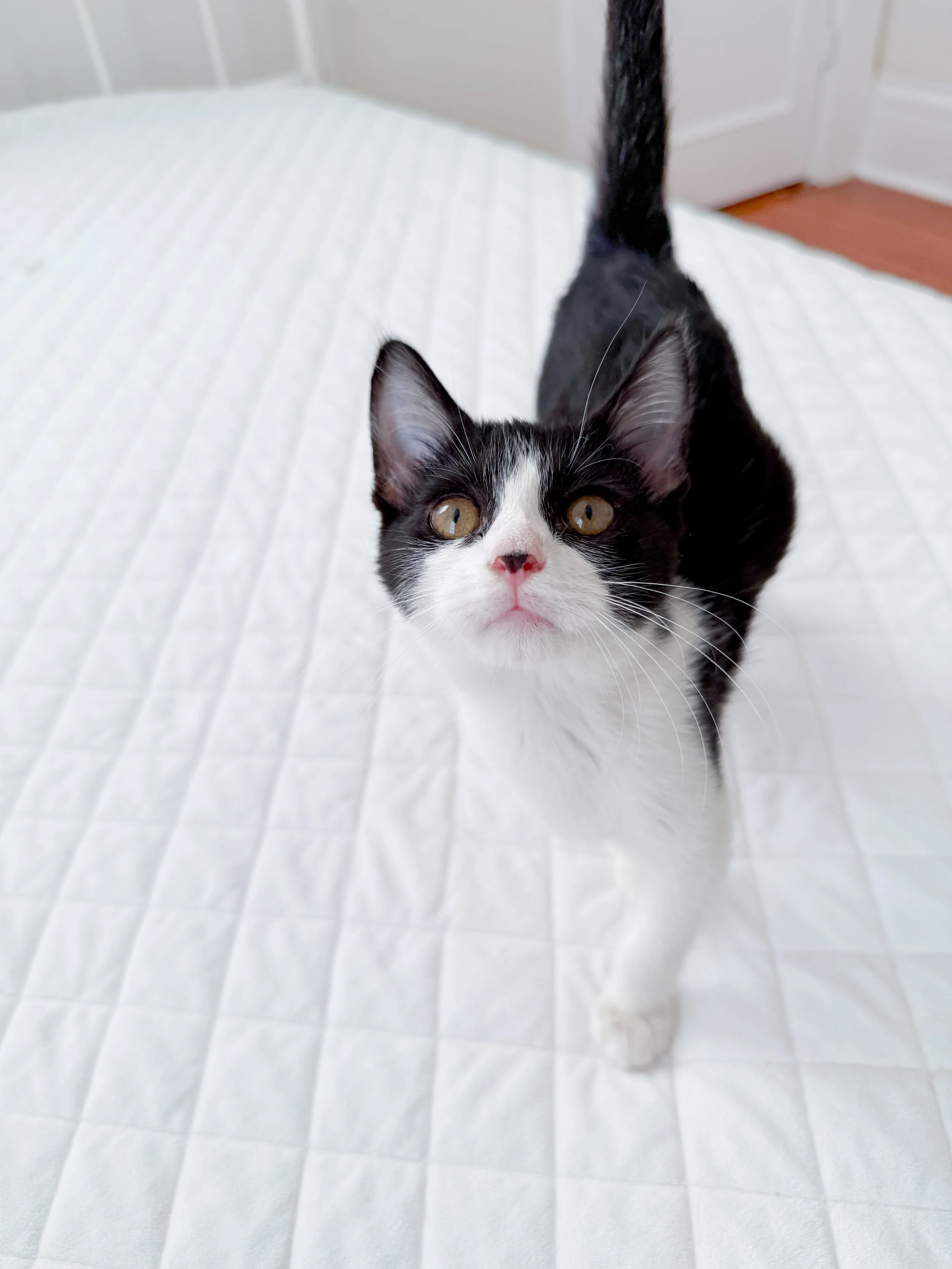 Yes, Fred is a little lady. She has transformed from the scrawniest and most worrisome of all her siblings into the most gorgeous heart-button-nosed tuxie, she has also grown into the most trusting, gentle, perfectly loving little pal. Fred must be adopted with or into a home that has a young playful kitten her age.