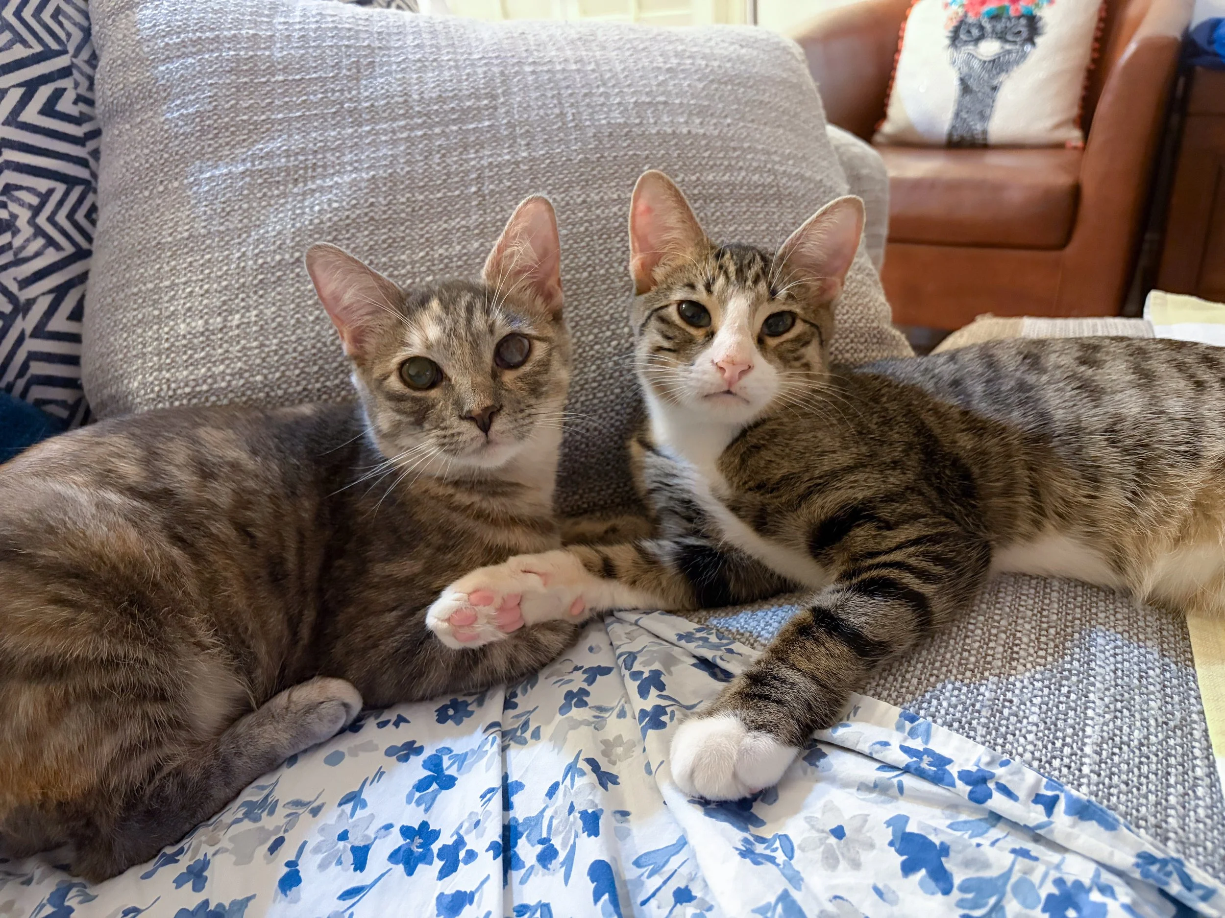 Albi & Sailor are two perfect kitties so very confident, loving and so so so silly! Albi is a very confident girl who knows exactly what she wants - and that is to be on your lap, perched atop your shoulder, snuggled right next to your face whenever she demands. Sailor is a precious angel sweetie pie with tiny bit more of respect for personal space but not much. Albi has a leg abnormality that causes her front left leg to fold inward and Sailor is ever so slightly vision impaired.