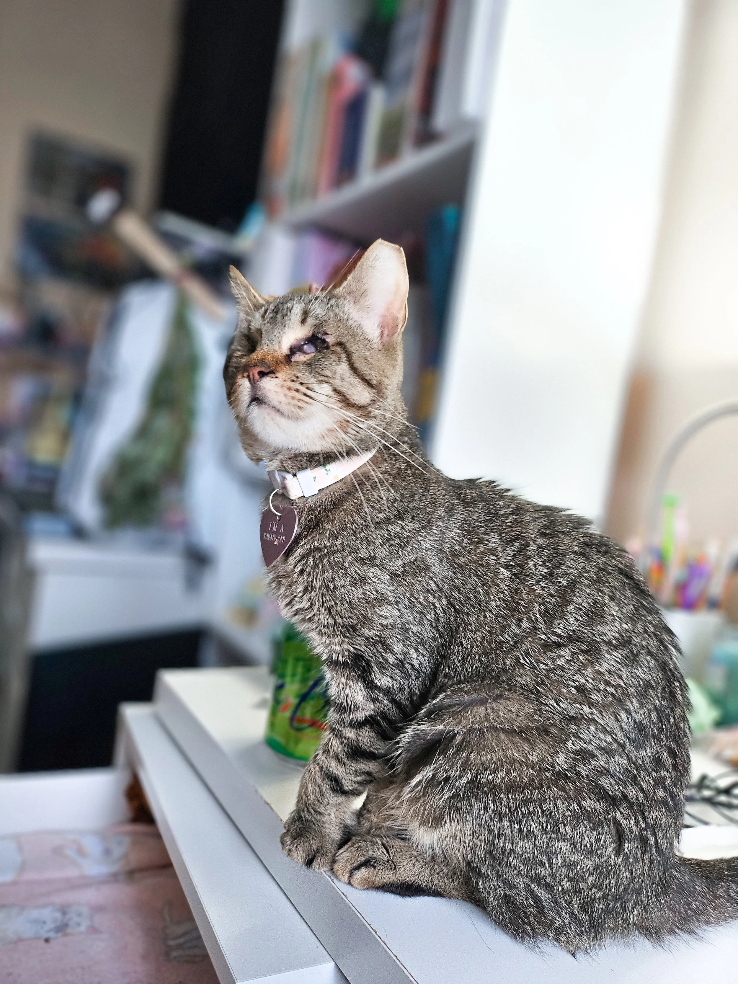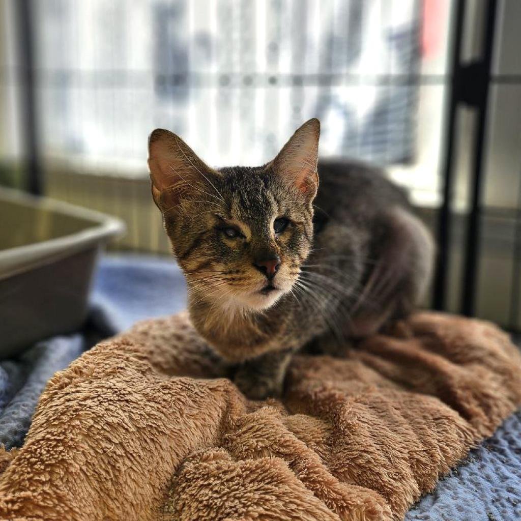 Sopi is a SUPER sweetheart and complete snuggle bug. She would be a perfect companion for a quieter home with no loud pups or kiddos. She is a true people’s cat and quite the talker with an adorably precious meow. Sopi does have limited vision but has no problem navigating new spaces quickly and can find her litter box food and water with ease. She is pretty clingy. She also has an abnormally shaped front paw that requires routine nail clippings. Sopi can be adopted solo or into a home with a friendly kitty friend.
