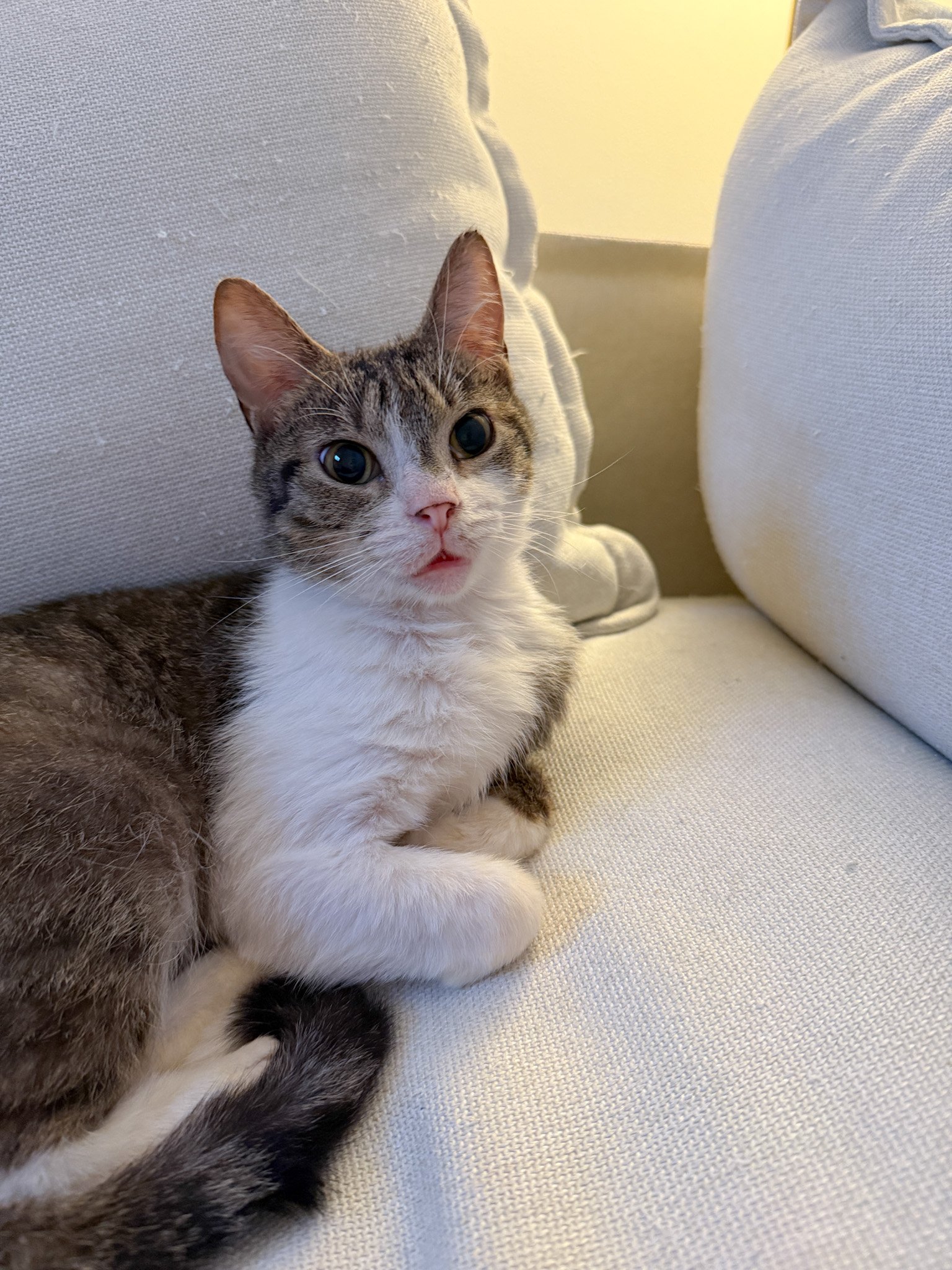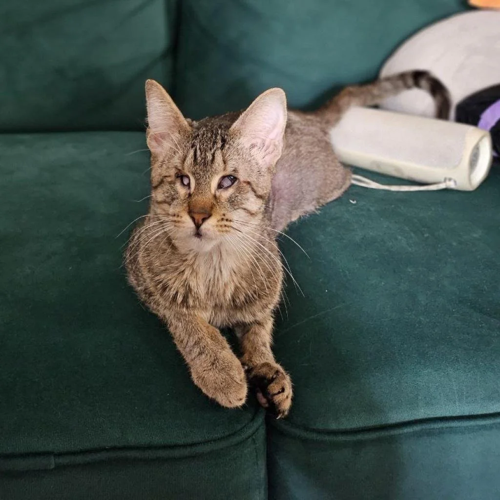 Butter Bean “BB” is as goofy as any creature can be. He has a mild form of cerebellar hypoplasia only adding to the silliness he’ll bring into your life. Shy and timid at first BB is a big needy love bug once he feels safe and secure. He loves cuddling, napping and sleeping with his humans. With a patient adjustment period he would do well with other friendly cats but expect a lot of half hearted hisses, slaps and falling over for the first short while. No kiddos or pups for this guy. BB can go up and down (slowly) staircases and has no problem climbing up couches on furniture to nap wherever is coziest or using a litter robot.