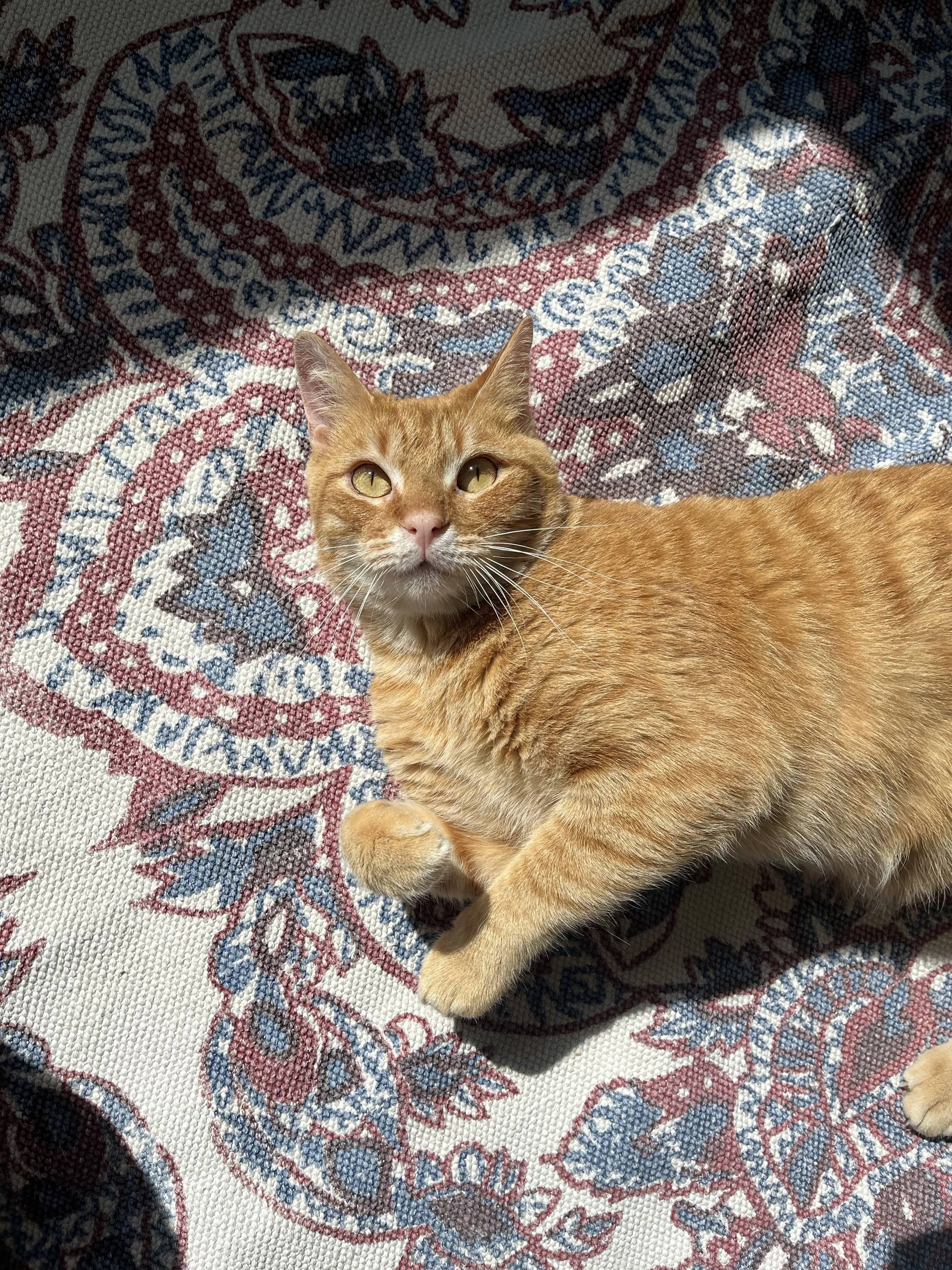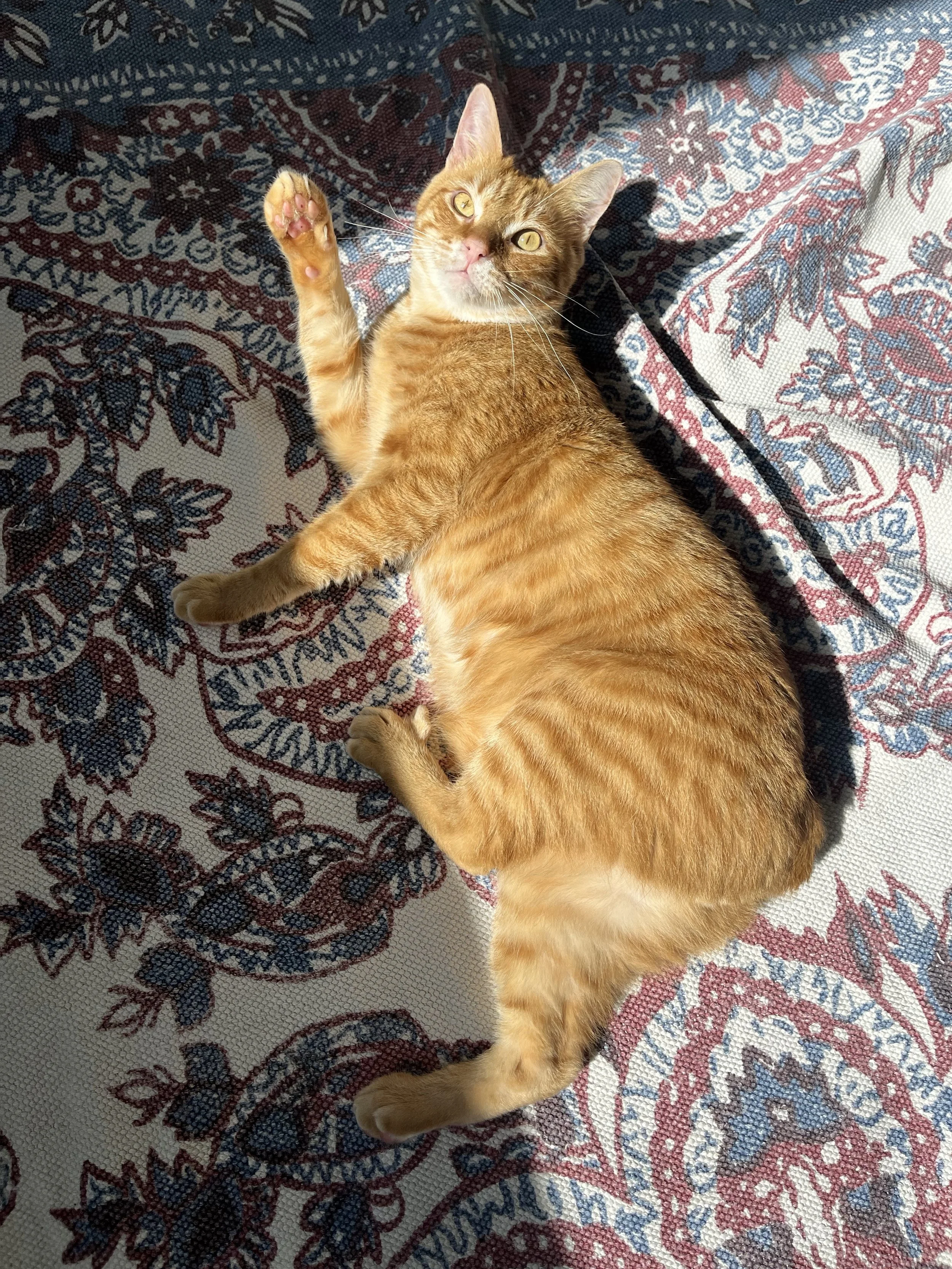 Salmon is sweet and loving and precious and shy. He needs an extended amount of time to warm up to new places and people compared to a typical tomato cat, BUT once he’s comfortable he is the biggest sweetie pie. Salmon would likely do well with another friendly young cat but absolutely no pups or kiddos and he seems to really have an aversion to men. Salmon can be adopted solo or into a home with a friendly kitty friend.