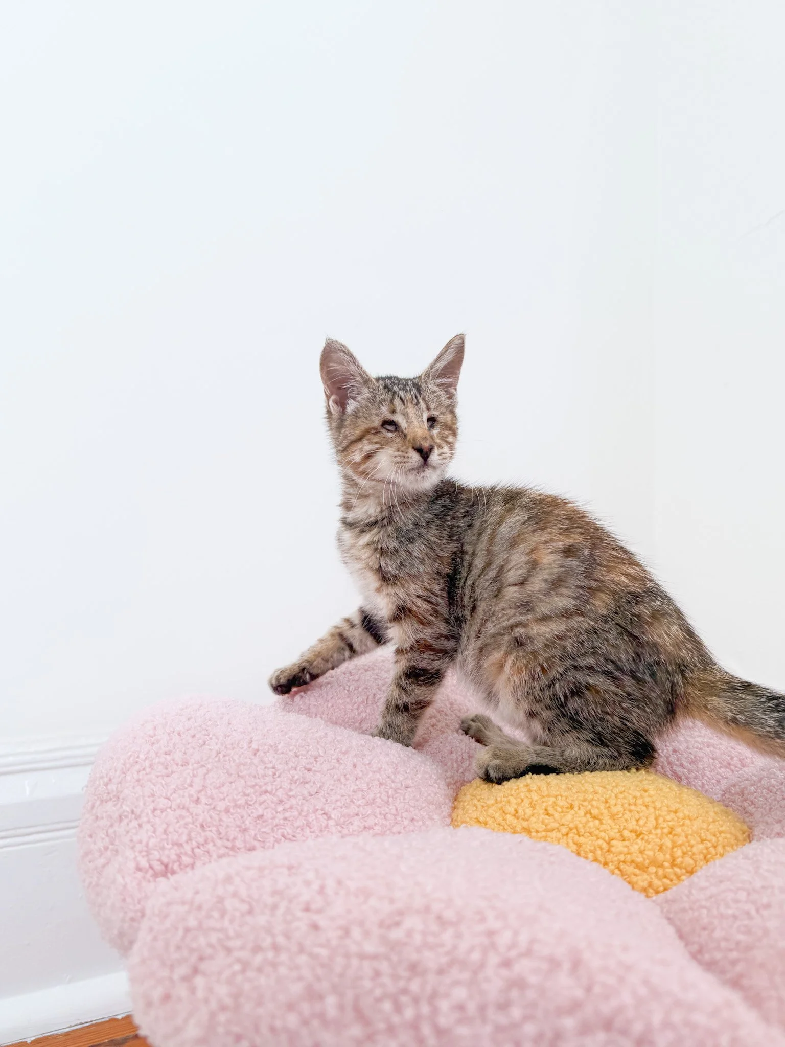 Roya arrived in 2023 from a local shelter after she was deemed unadoptable due to her cerebellar hypoplasia. While she may move a little different than most kitties she had absolutely no idea her groovin’ was any different. She could do nearly everything a typical kitty cat could apart from jumping on counters.